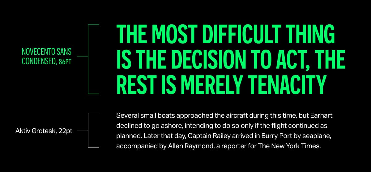 It's a strong look suited to anything from 'can-do' logistics and engineering through to charities with a hard hitting reason for being. A neutral body copy choice like Aktiv Grotesk is the perfect companion, quietly and earnestly going about its work.