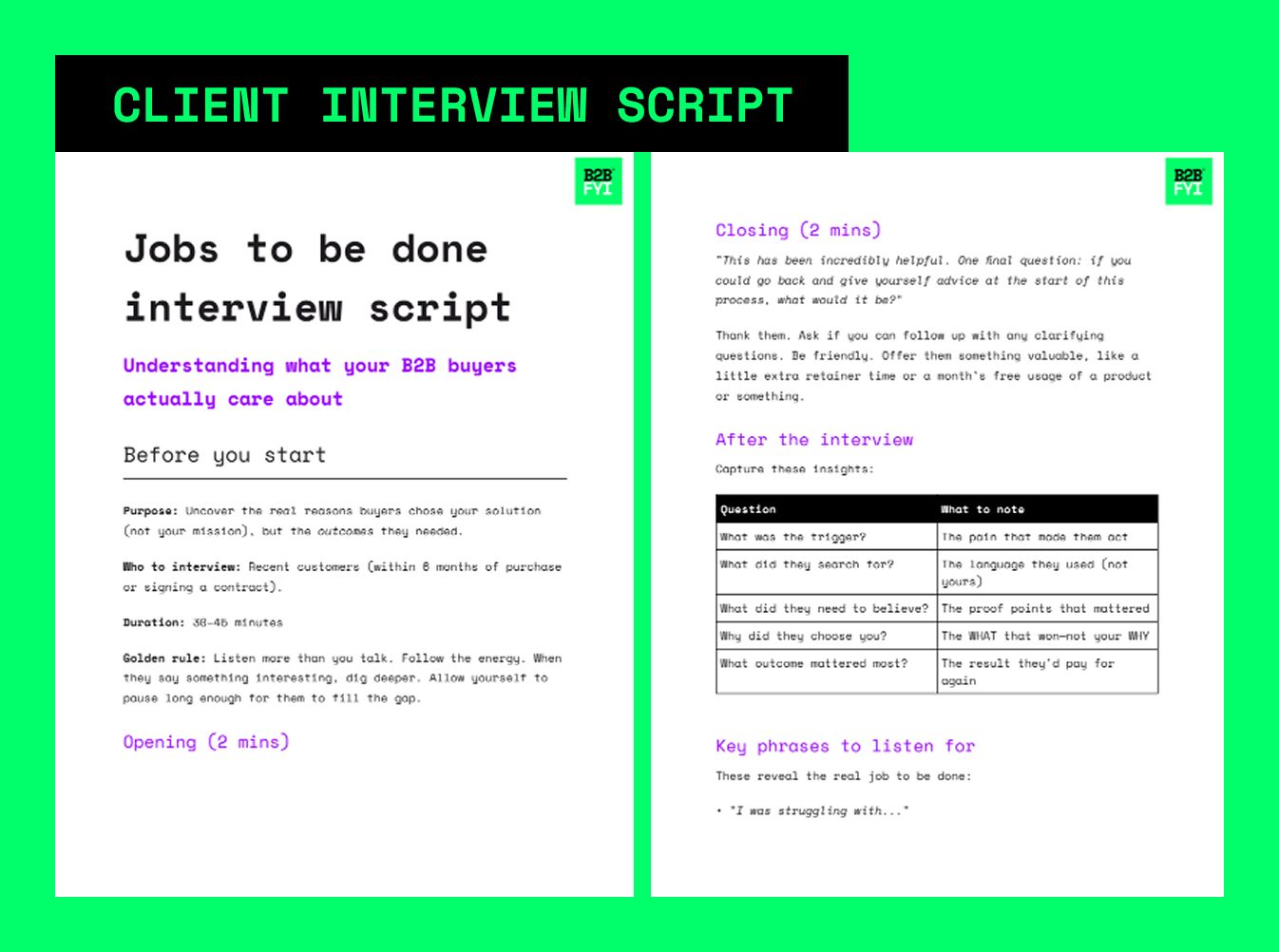 “Jobs to be done” client interview script: A PDF guide to running a full client or customer interview, including a script of exactly what and how to ask, as well as how to follow it up.